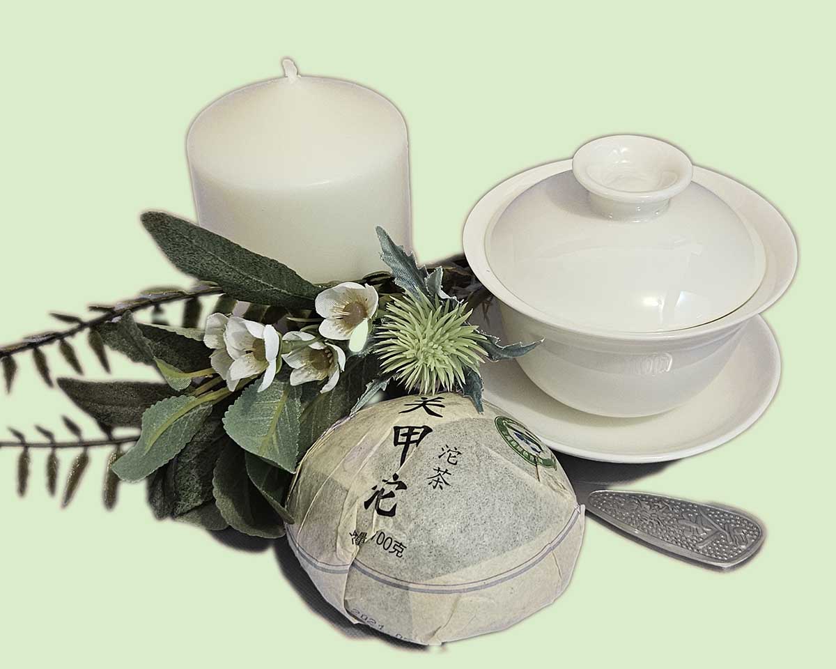 Пуэр Шен 100 г, Гайвань (фарфор), нож для пуэра, праздничная свеча